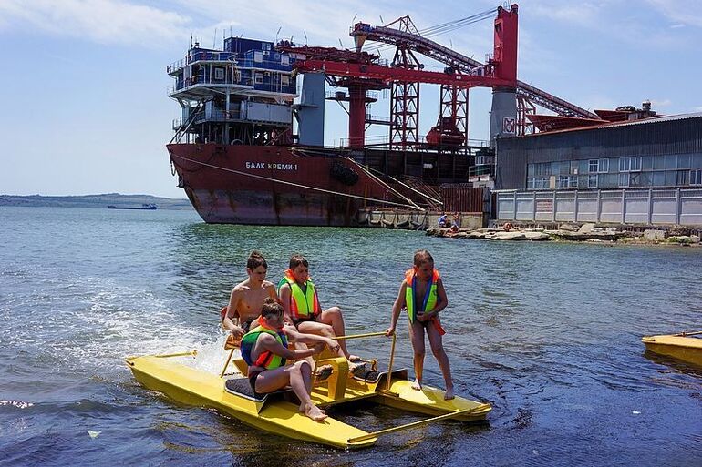 2014. 19.06. 18.10. Пляж «Черепашка». Дети на надувной лодке