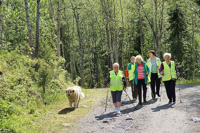 24. 2016. 22.06. Полярно-альпийский ботанический сад-институт (ПАБСИ) им. Н.А. Аврорина. Пожилые женщины занимаются скандинавской ходьбой.