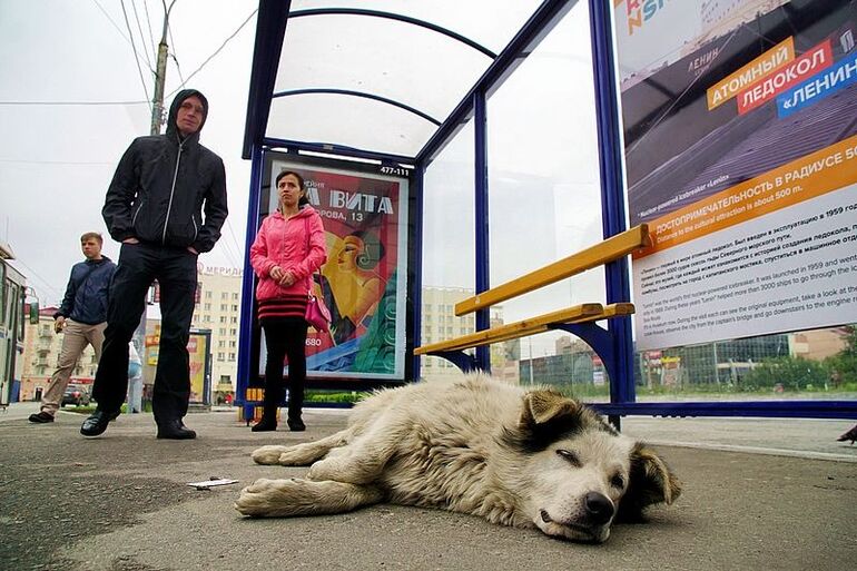 20. 2016. 20.06. Остановка общественного транспорта. Пассажиры и бездомная собака