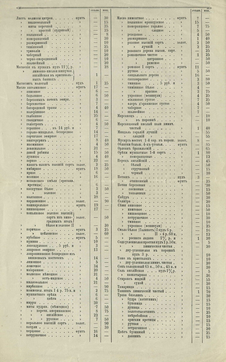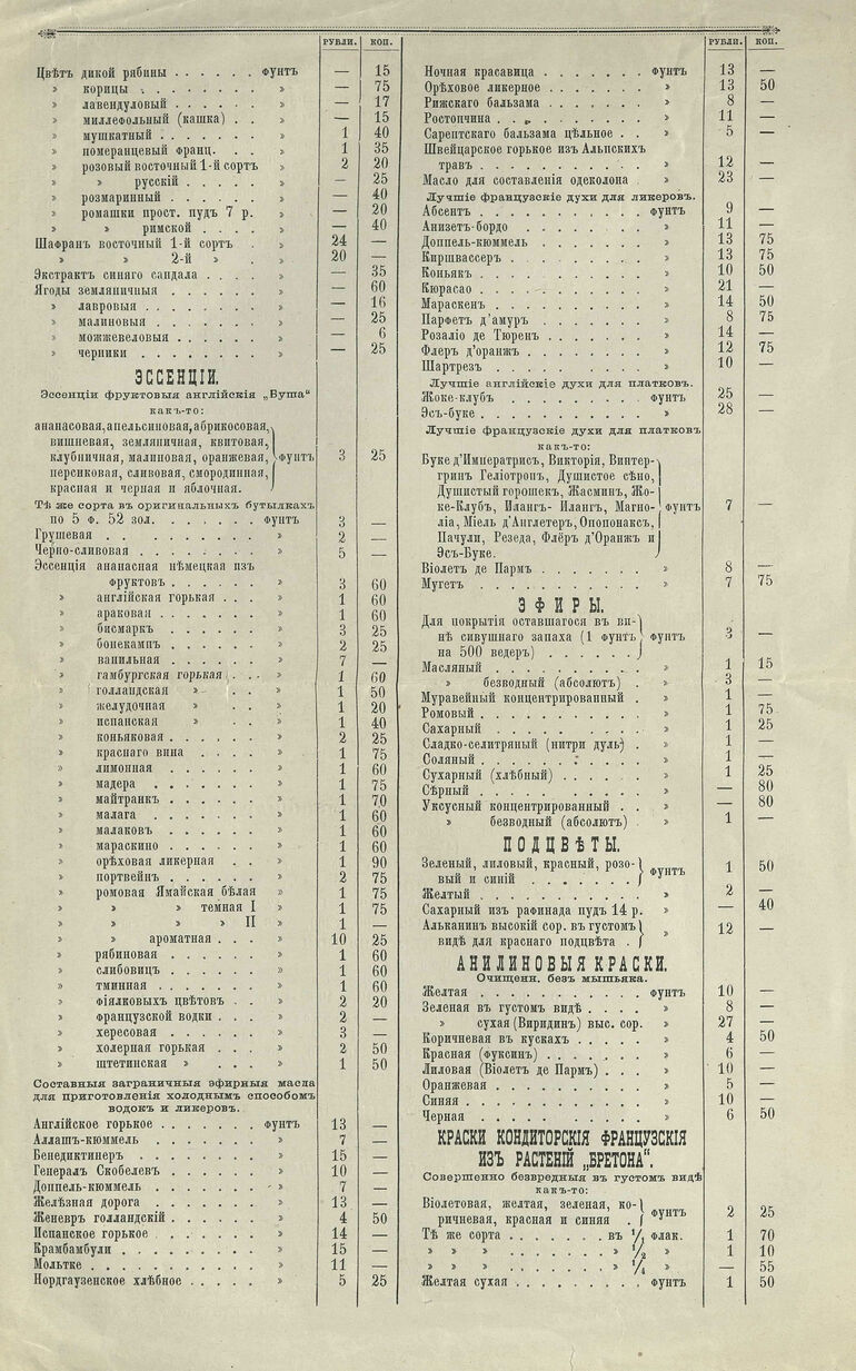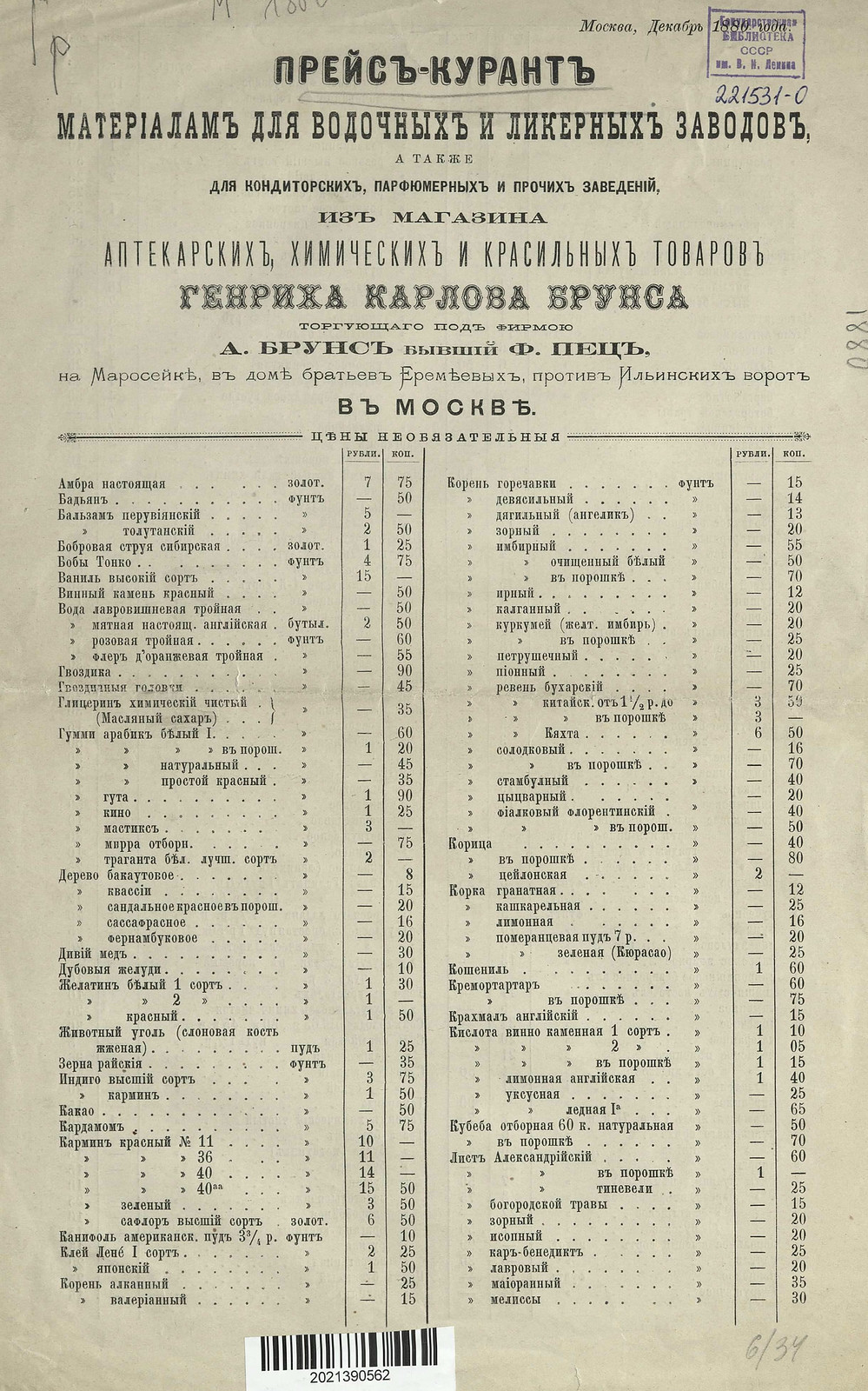 1880. Прейскурант материалам для водочных и ликерных заводов, а также для кондитерских, парфюмерных и прочих заведений, из магазина аптекарских, химических и красильных товаров Генриха Карлова Брунса, торгующего под фирмой А. Брунс бывший Ф. Пец, на Маросейке, в доме братьев Еремеевых, против Ильинских ворот в Москве.