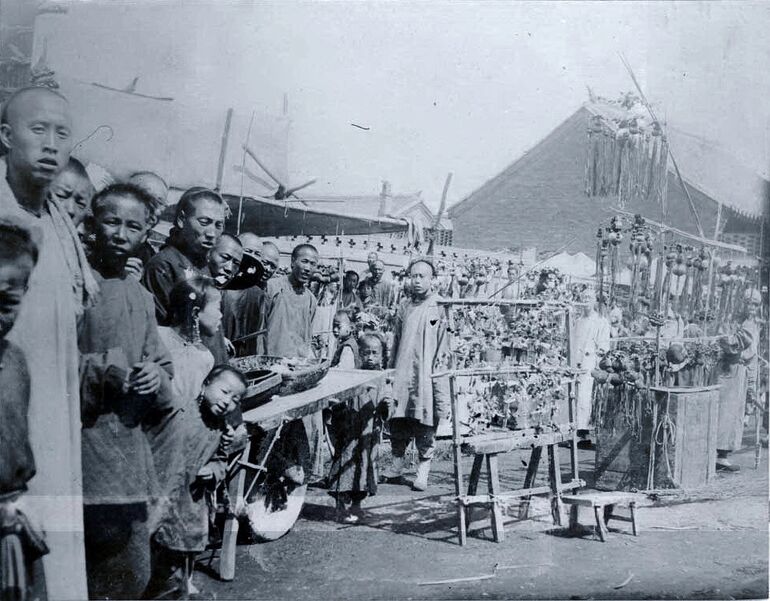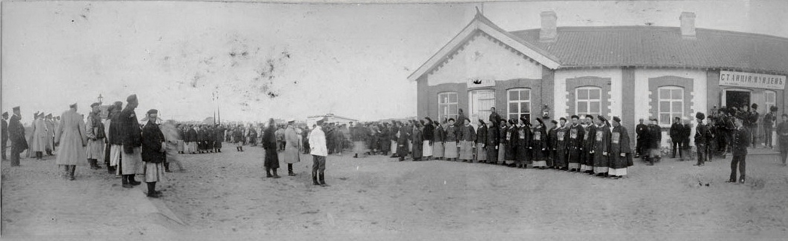 43. Официальное мероприятие, происходящее при стечении русских и китайских официальных лиц и военных, возле входа в зал 3-го класса железнодорожного вокзала в Мукдене