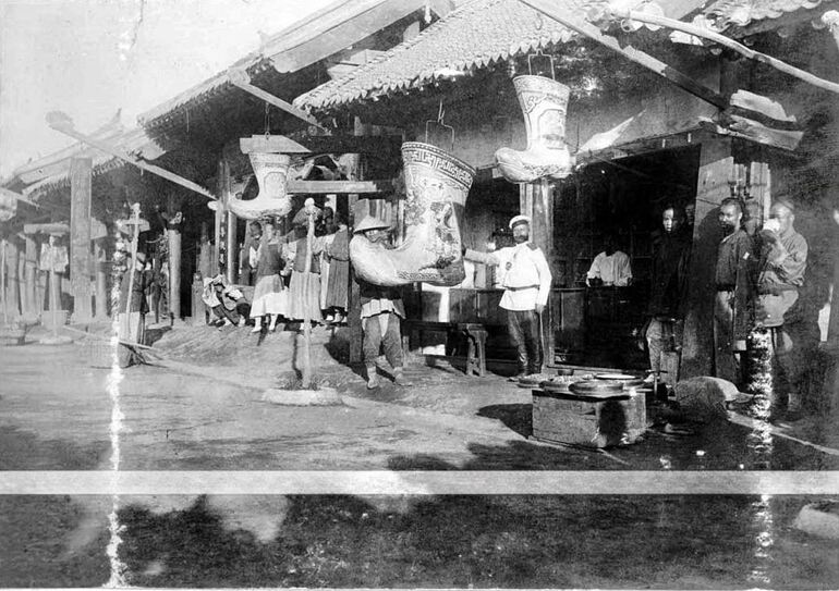 51. Мукден. Нижний чин русской императорской армии позирует возле торговой лавки