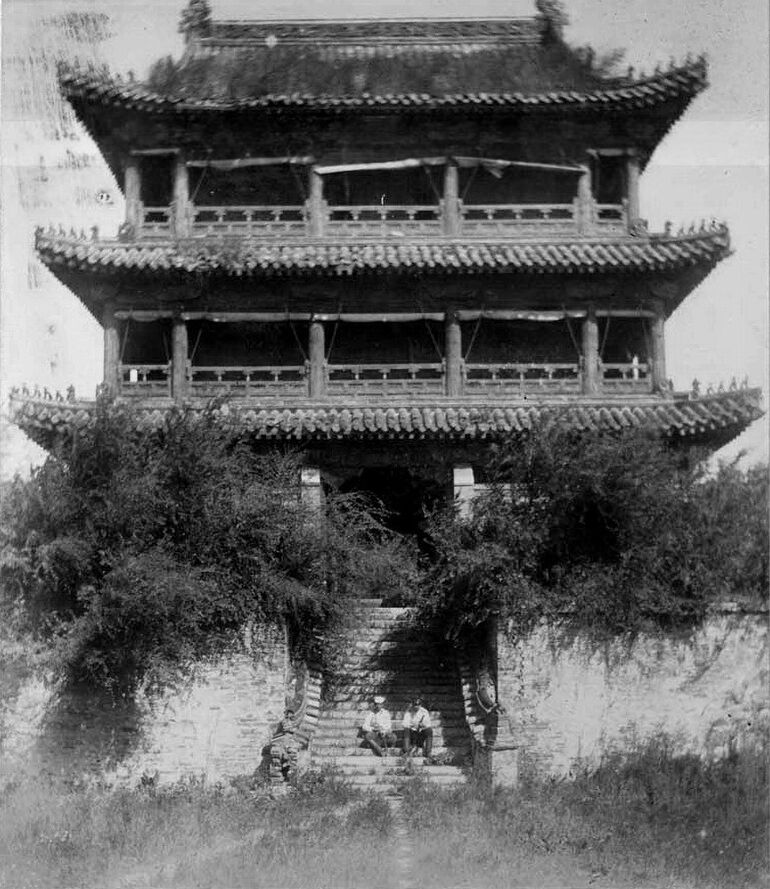 55. Мукден.Два чина русской императорской армии сидят на ступенях лестницы, ведущей в башню Феникса (Фень Хуань Лоу), самой высокой (21 метр) постройки на территории дворцового комплекса