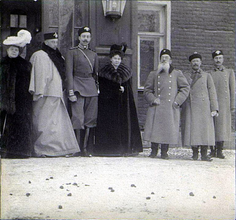1900-е. Группа офицеров Л.-гв. Московского полка с двумя дамами возле офицерского собрания