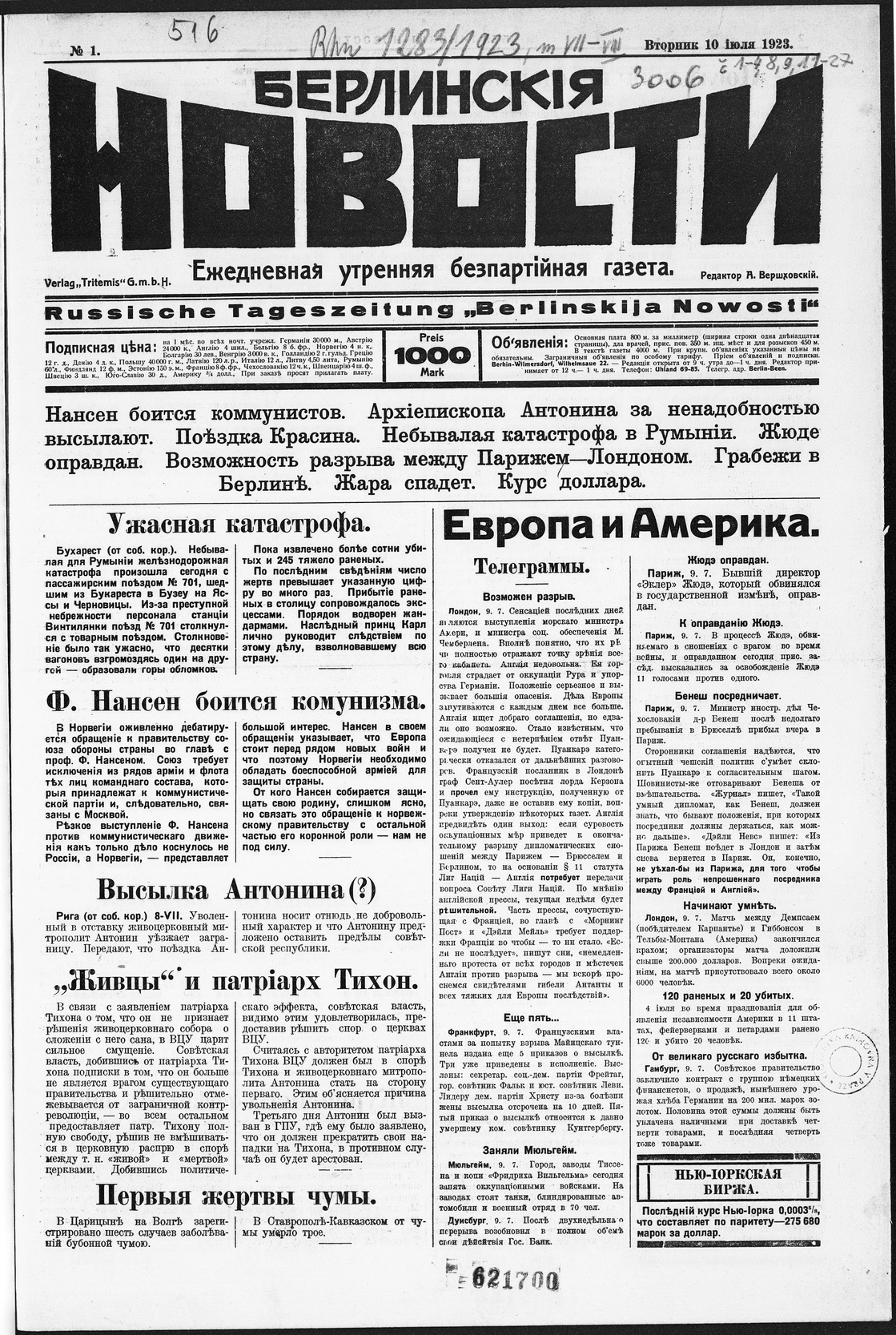 1923. «Берлинские новости» (Берлин)