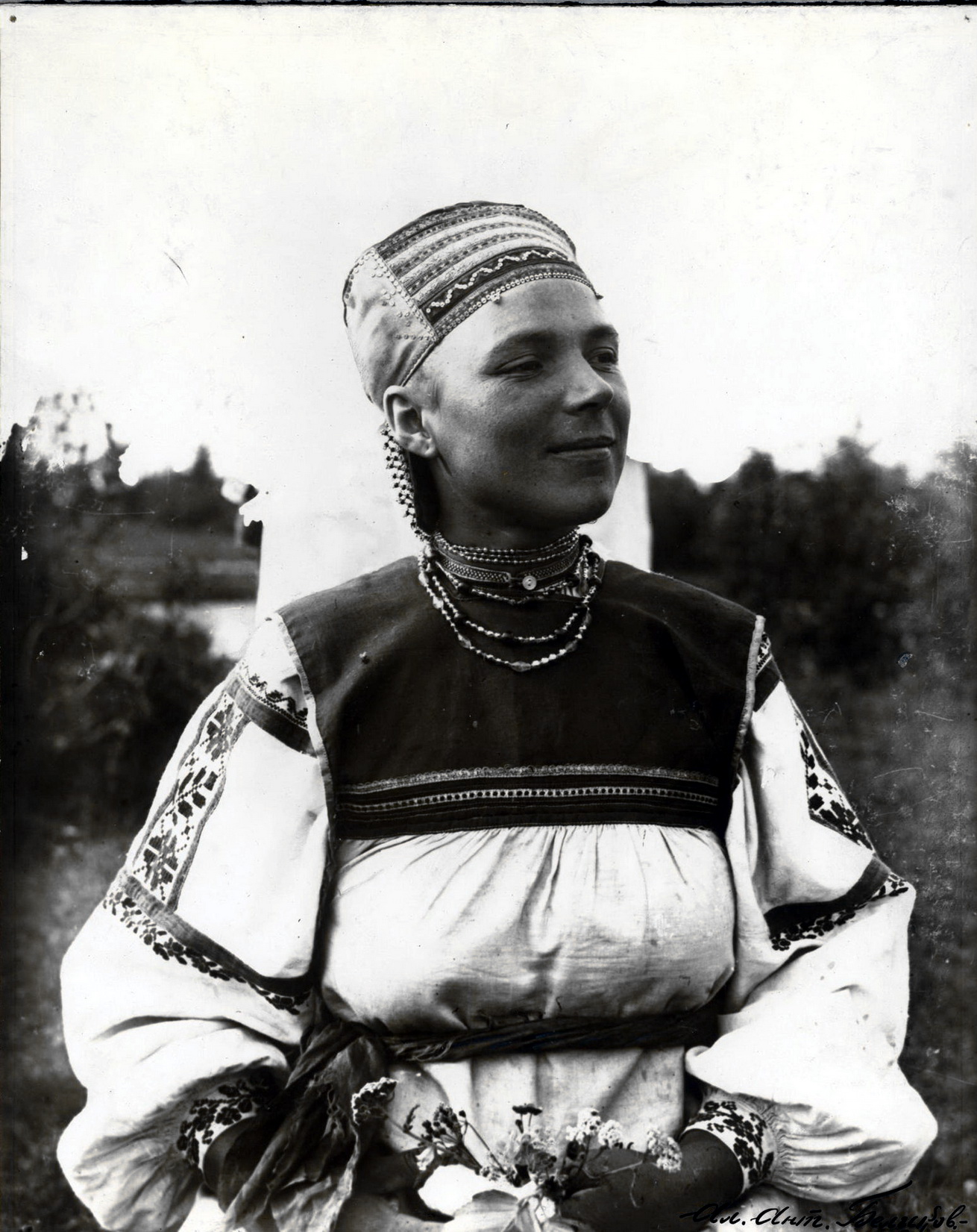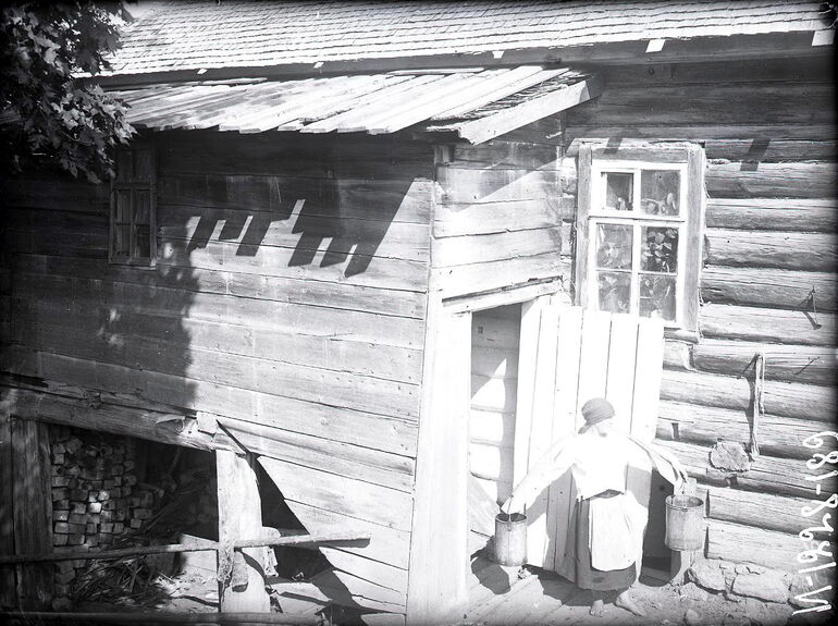 Женщина с коромыслом у входа в избу А.И. Лямина