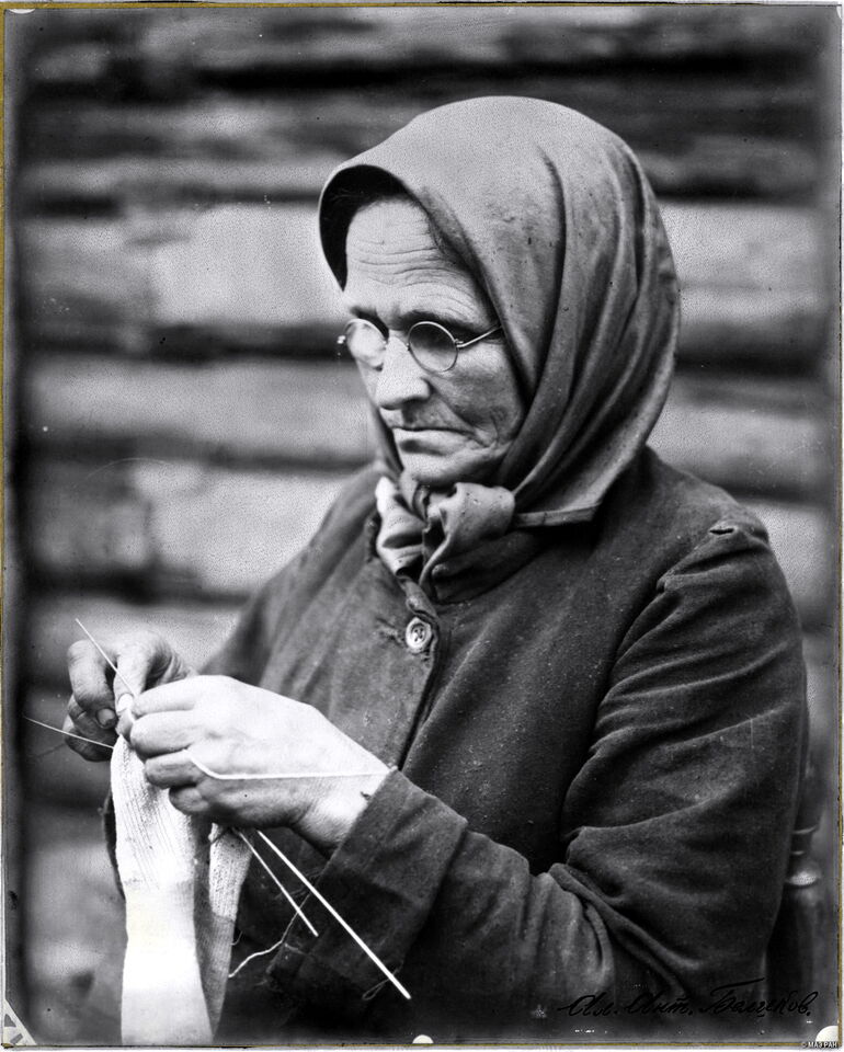 Середнячка - вдова Е.М. Сергеева за вязанием чулка
