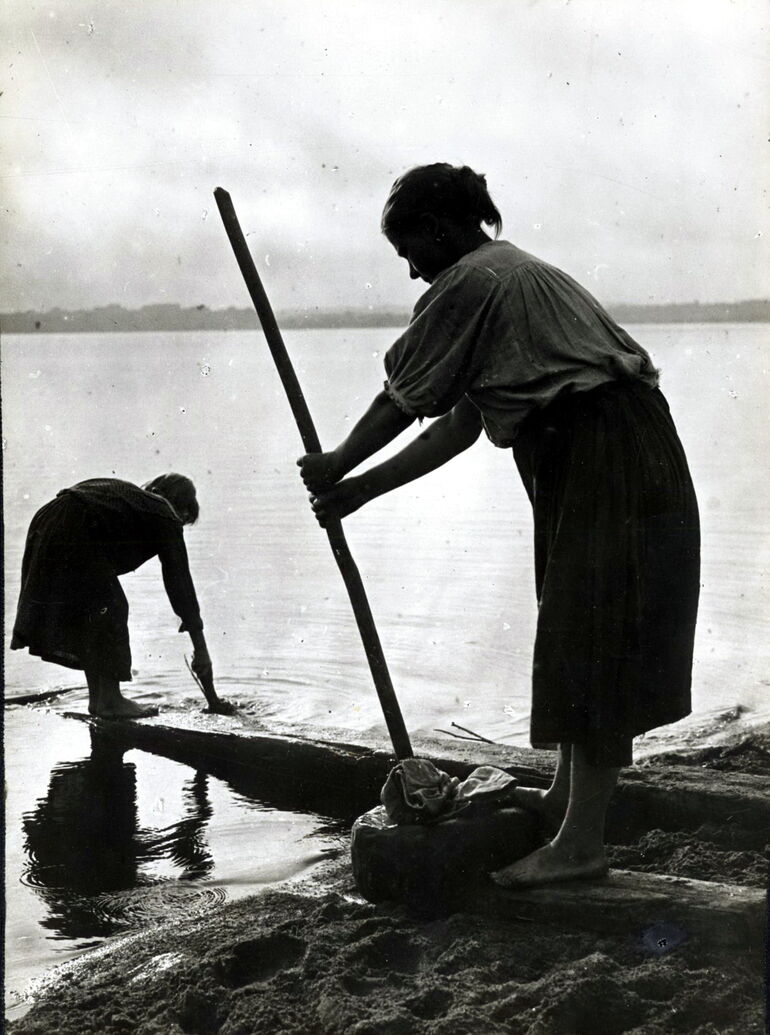 Пелагея Степановна Кирпенова (18 лет) за полосканием белья в корыте «хумбар». Палнаволок д.