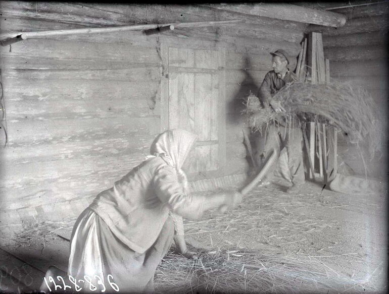 Отбивка ржаных зерен и мятье соломы в сарае.