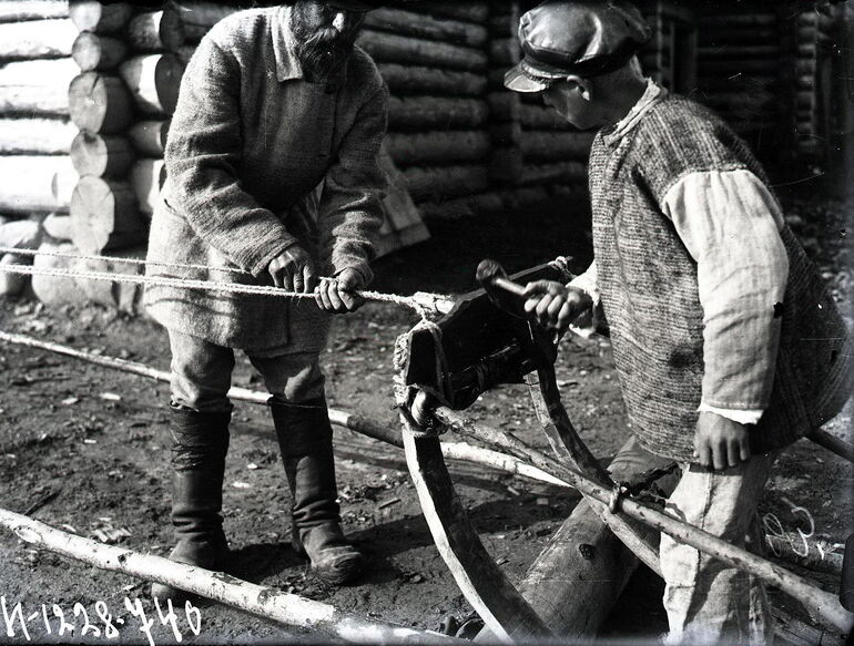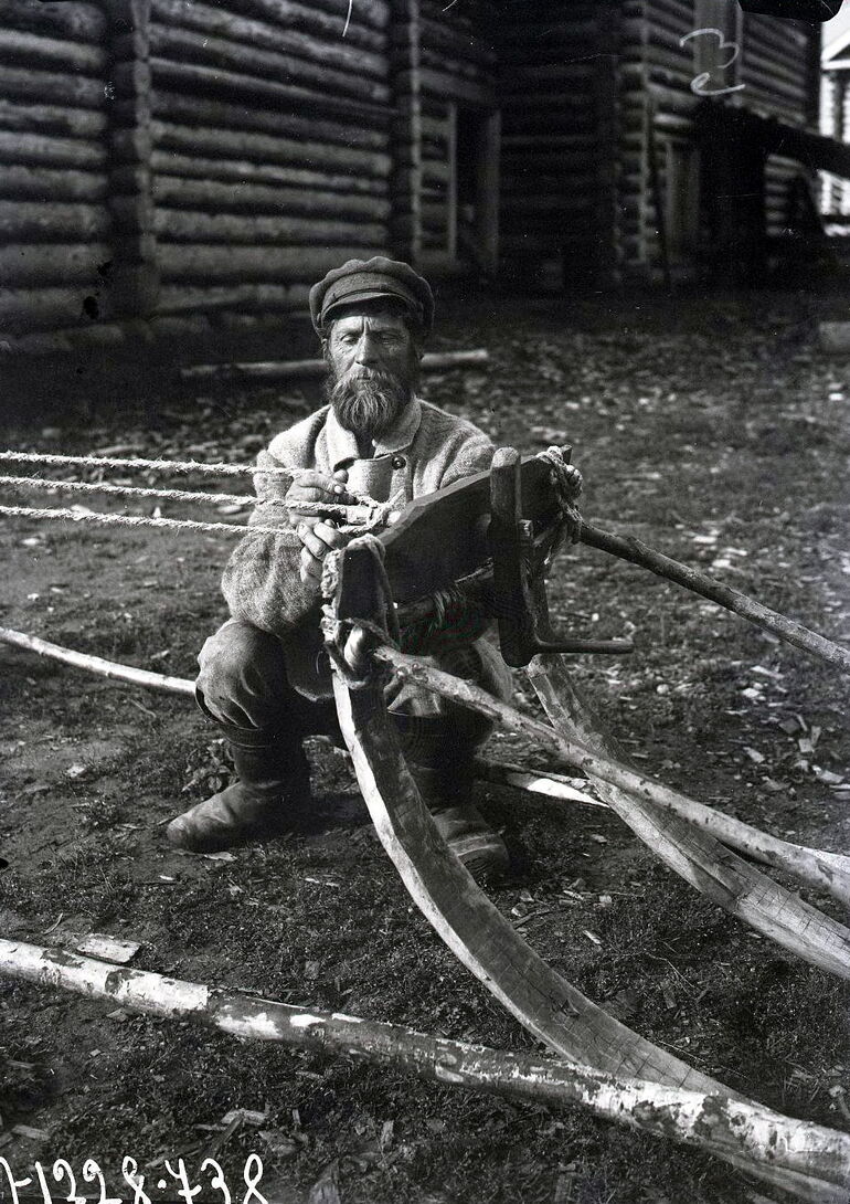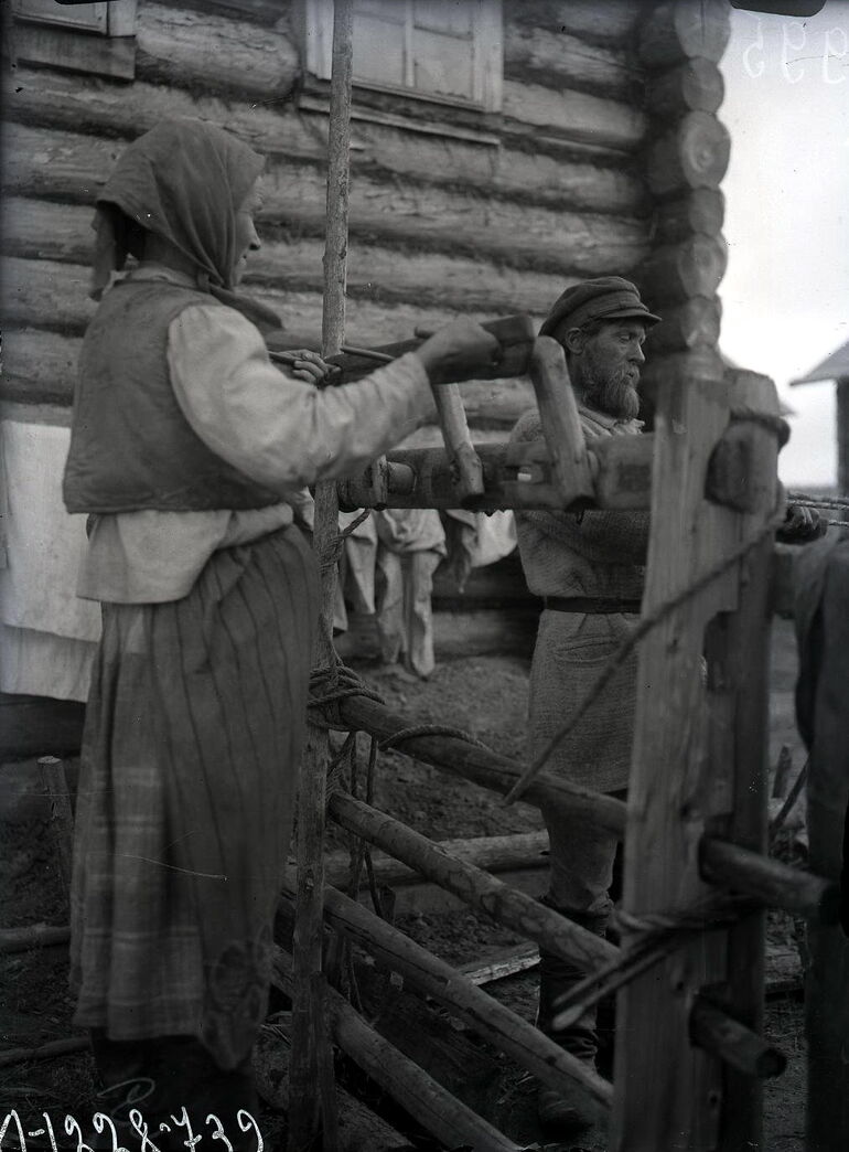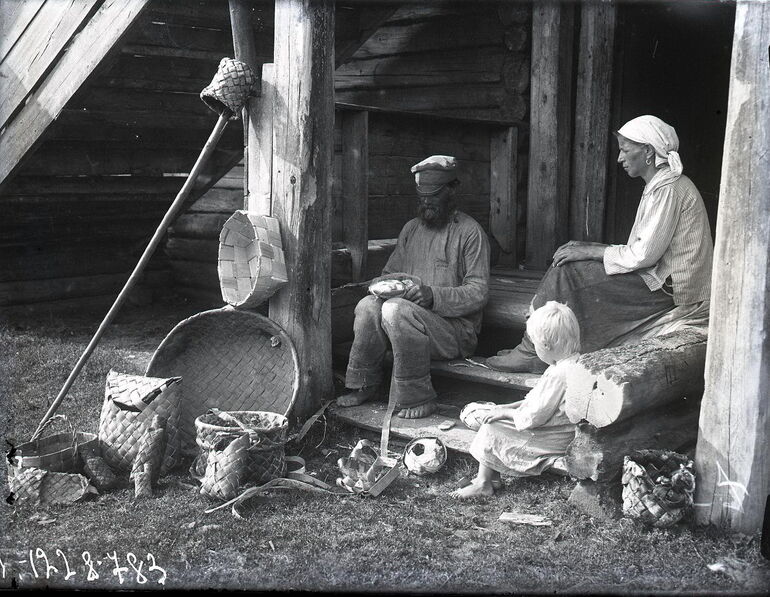 Плетельщик за работой, с женой и дочерью. Коткозеро д.