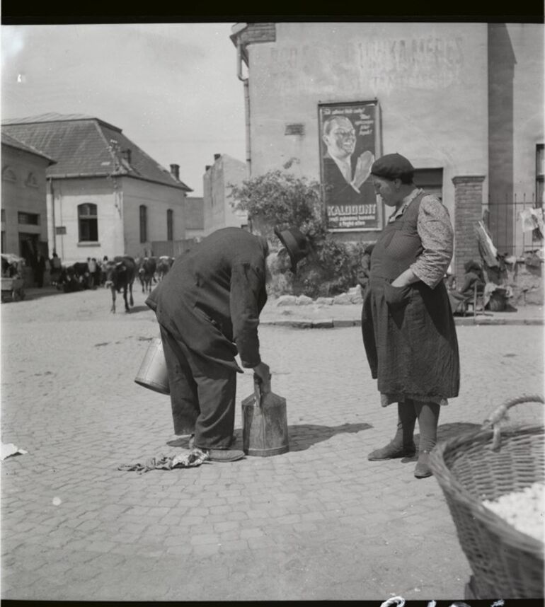 Ежедневные события на главной улице - стадо коров, продавец молока, женщина-торговец
