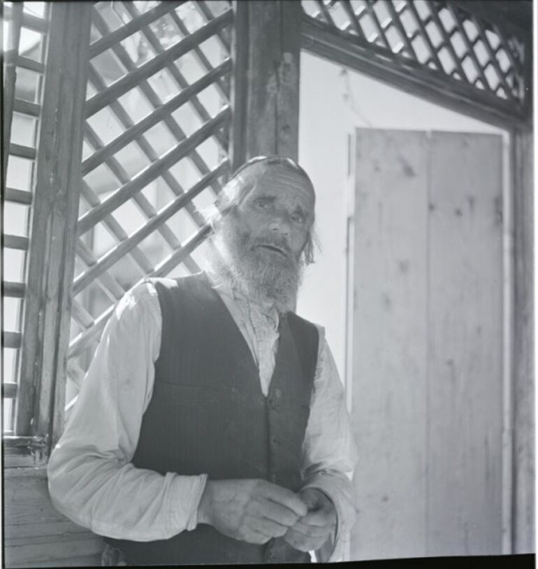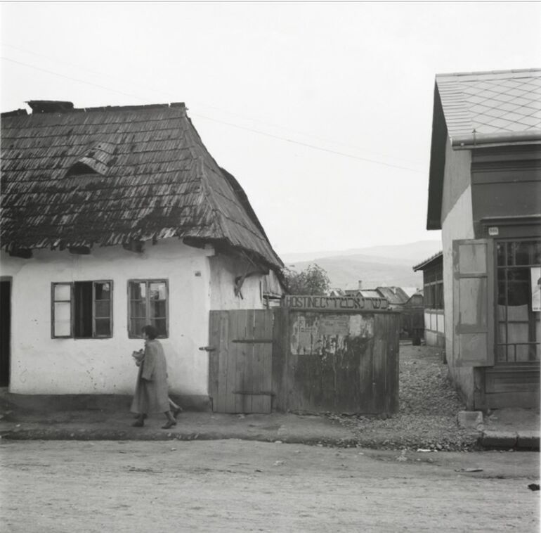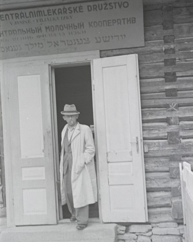 Мужчина у входа в Еврейский Центральный Молочный Кооператив, Ясин, недалеко от Рахова