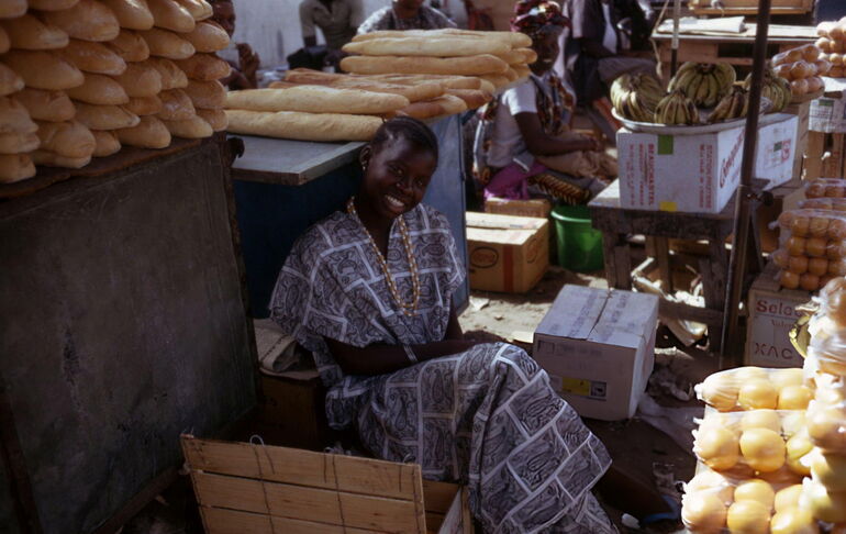 Женщина народности волоф продаёт хлеб на рынке