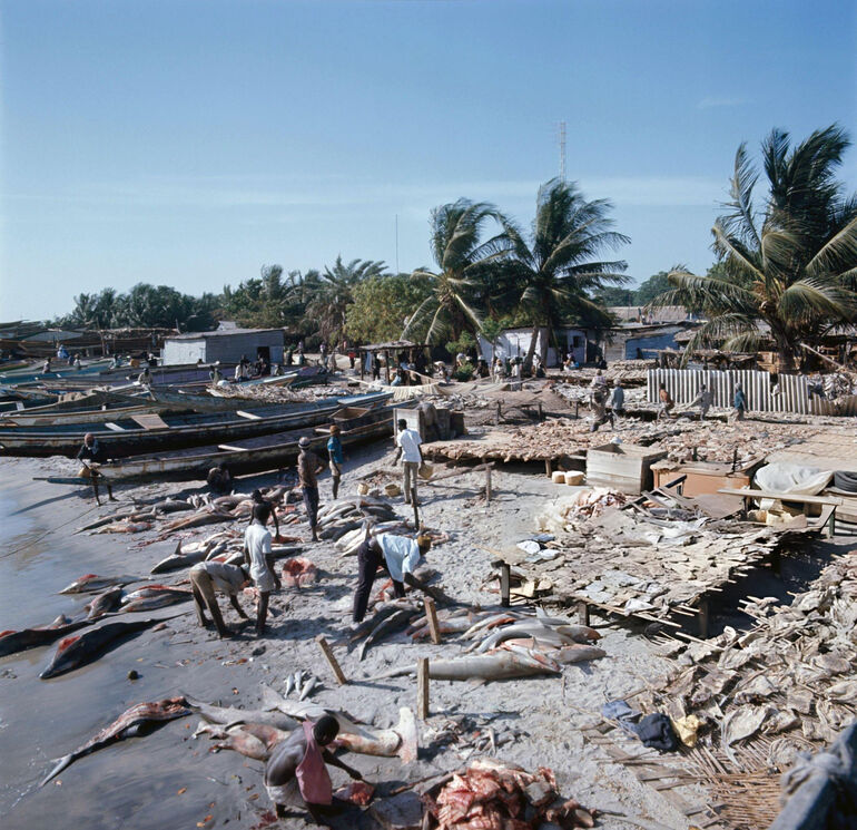 Рыбаки потрошат рыбу на пляже в Ханн-Бель-Эр.
