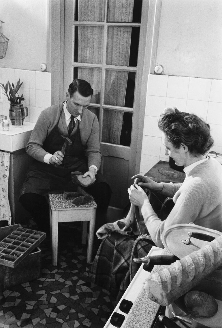 1950. Мужчина и женщина ремонтируют обувь и одежду