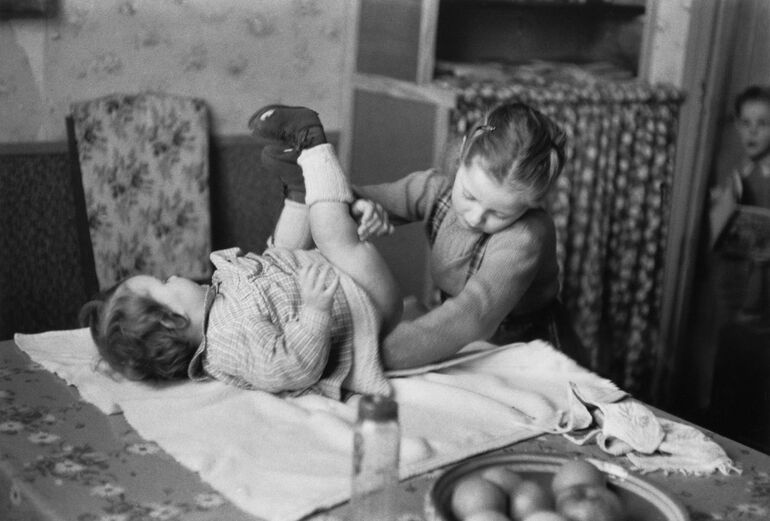 1950. Семейная жизнь. Маленькая девочка меняет подгузник младенцу