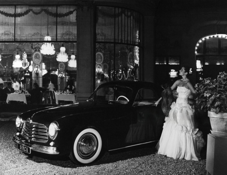 1950. Модель позирует перед рестораном и автомобилем Simca