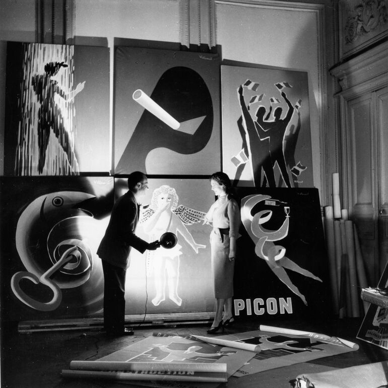 1953. Бернар Вильмо рассматривает один из своих плакатов в своей студии