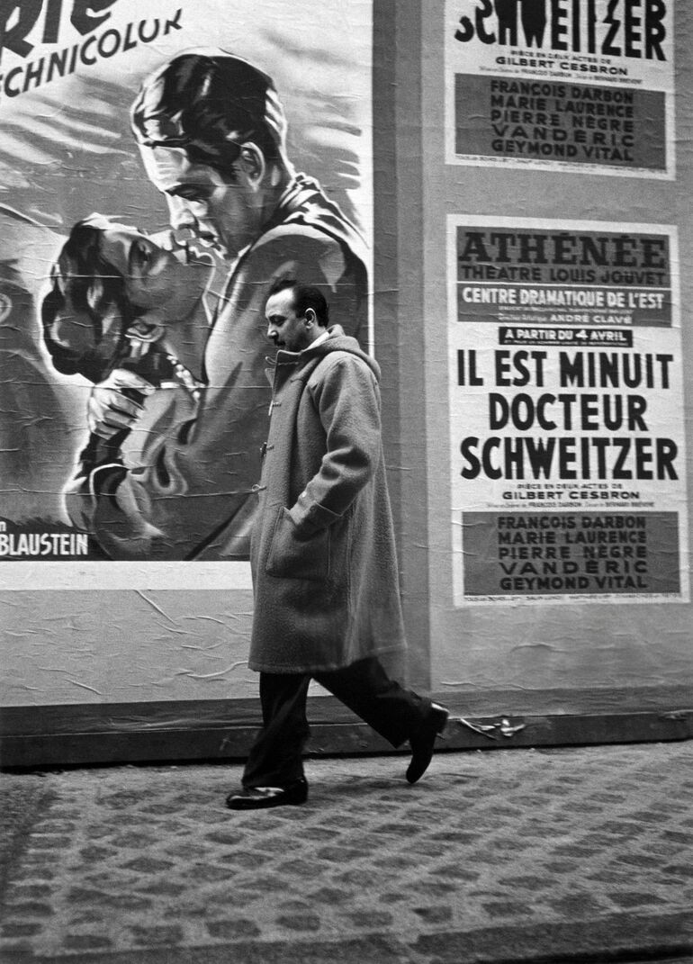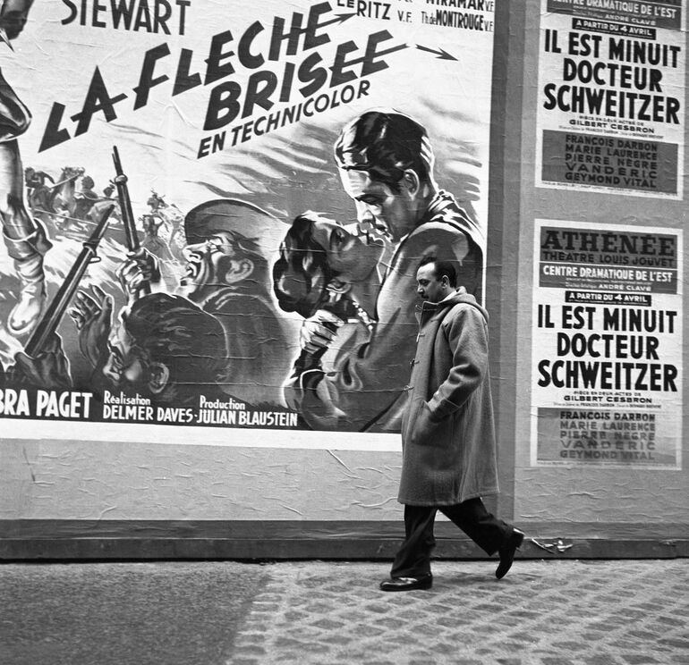 1950. Джанго Рейнхардт проходит мимо киноплаката «Сломанная стрела» и плаката к пьесе «Полночь, доктор Швейцер»