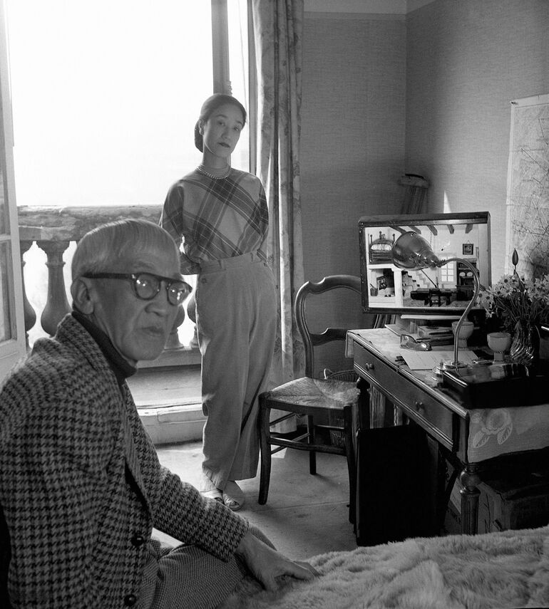 1950. Художник Леонард (Цугохару) Фудзита и его партнерша Кимиё Хориучи в комнате с видом на сады Пале-Рояль