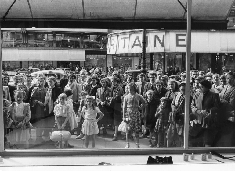 1953. Толпа людей рассматривает витрину универмага «La Belle Jardinière» на фоне вывески универмага «La Samaritaine», июнь