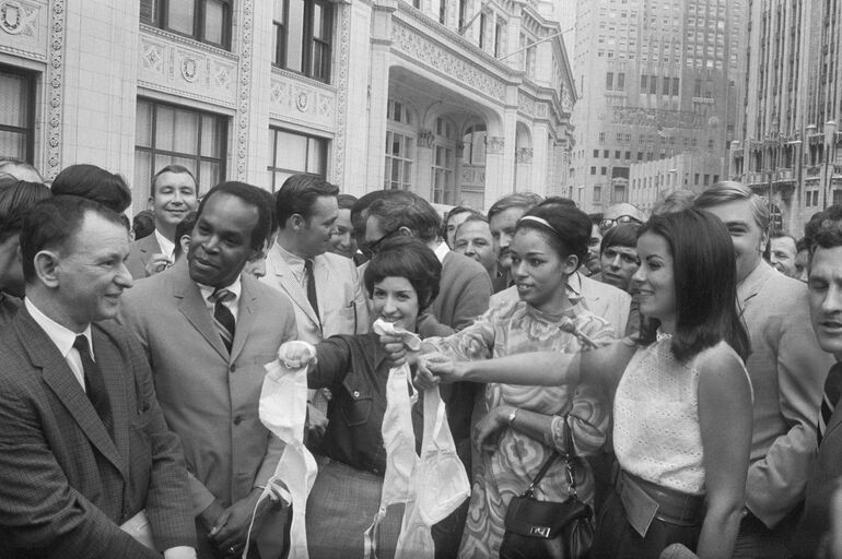«Это настоящее чувство свободы», — сказала 20-летняя Барбара Страттон (слева), держа в руках бюстгальтеры вместе с Оретой Смит (в центре) во время демонстрации против ношения бюстгальтеров. Ни один бюстгальтер не был снят на месте, и арестов за непристойное поведение не было. Они выбросили свои бюстгальтеры в реку и получили штрафы за загрязнение реки.