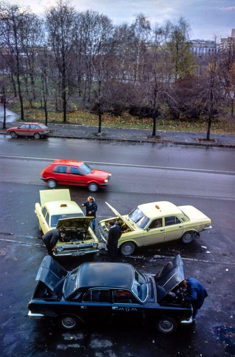 28. Таксисты ремонтируют свои машины на обочине дороги
