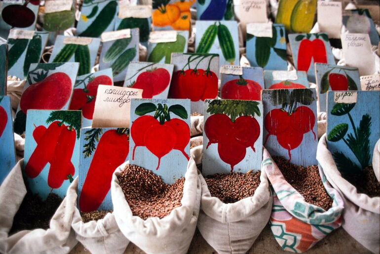 31. Витрина с семенами овощей, выставленными на продажу в Москве