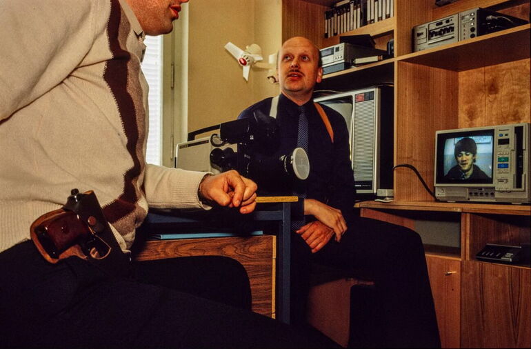 41. Группа отдела по расследованию преступлений в комнате для сотрудников в штаб-квартире КГБ просматривает видеоматериалы с места преступления