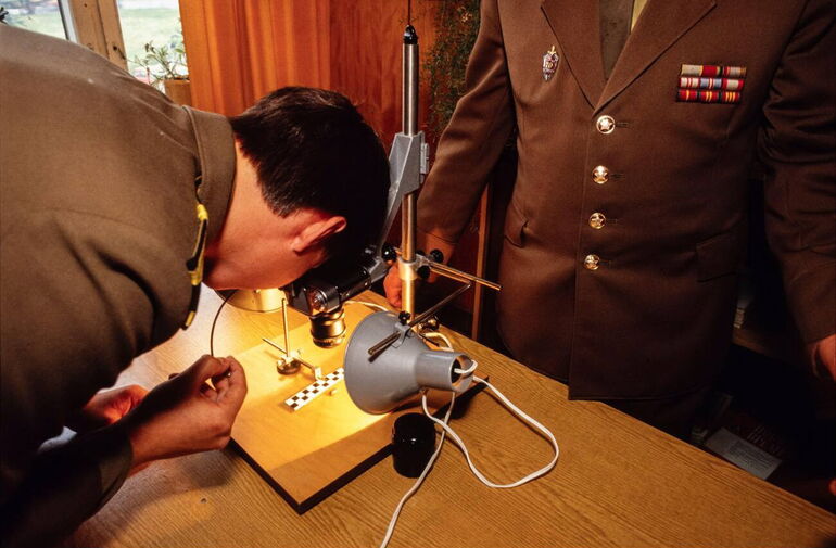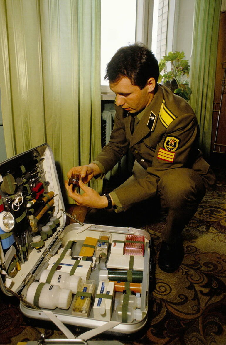 51. Высшая школа КГБ. Сотрудник КГБ изучает набор для криминалистической экспертизы места преступления