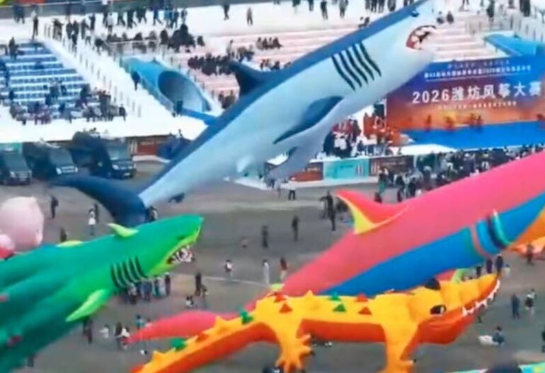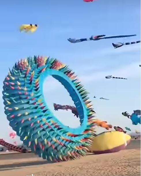 Вирусность этих кадров легко объяснить. Воздушный змей обычно связан с чем-то детским и лёгким, но в Вэйфане он превращается в