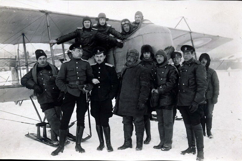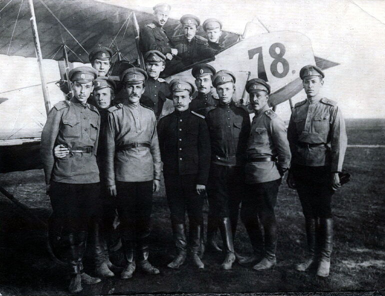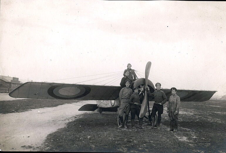 06. Анатолий Розенфельд с товарищами по учёбе и чинами постоянного состава школы Императорского Московского общества воздухоплавания у самолёта Morane-Saulnier type L, школьный номер 203