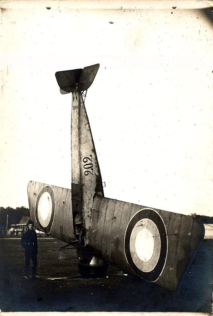 05. Вольноопределяющийся Анатолий Розенфельд возле учебного самолёта Morane-Saulnier type G, оборудованного дополнительными передними противокапотажными колёсами