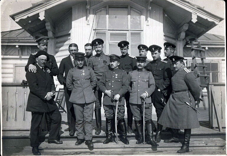 10. Визит представители японской военной миссии в авиационную школу ИМОВ. Слева в группе, в гражданской одежде – инструкторы А. Я. Докучаев и А. М. Габер-Волынский