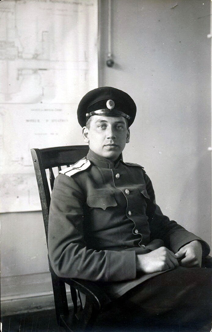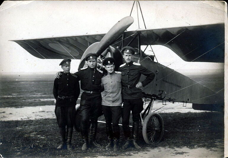 31. Выпускники школы авиации Императорского Московского общества воздухоплавания прапорщики Розенфельд, Жеребцов, Полозов и чин постоянного состава механик Александр Иванович Жуков, июль 1916 года