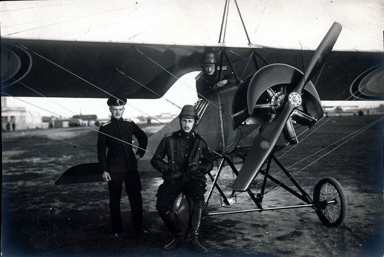 30. Птенцы «мораньего гнезда» прапорщики Жеребцов, Пинчуков и Михаил Николаевич Полозов в звании рядового из вольноопределяющихся у самолёта Morane-Saulnier type L на Ходынском аэродроме