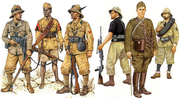Итальянские солдаты из различных частей, воевавшие в Эритрее. Второй слева — абориген-аскари, третий справа — фашист-доброволец с ручным пулеметом.