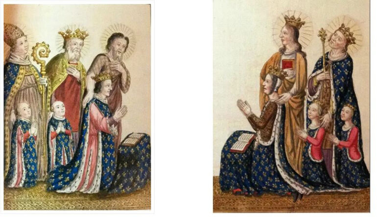 Вот взять хотя бы вот эту акварельную гипсовую вышивку XIVв. из Шартры. Не удивляйтесь! Коленопреклонённый дядька – это Карл V, два маленьких лысеющих малыша – это его сыновья – будущий король Франции Карл VI и Луи Орлеанский.