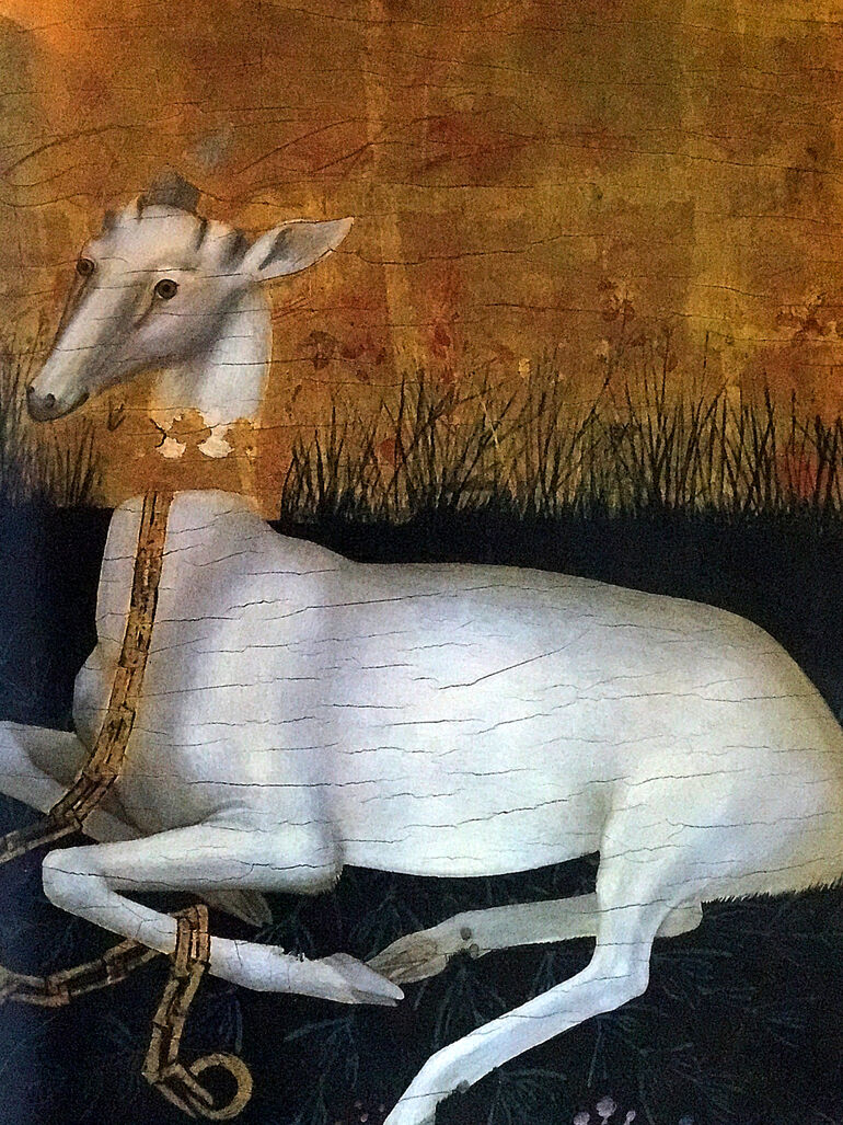 Вся картина заполнена личной символикой короля. На внешней стороне, а мы помним, что диптих – это две скрепленные шарнирами доски, изображен белый олень – личная эмблема Ричарда. Олень лежит на папоротнике и розмарине – символах королевы Анны Чешской, а на заднем плане мы видим ирисы – символы второй супруги Ричарда – малолетней, если быть точной – семилетней Изабеллы Французской.