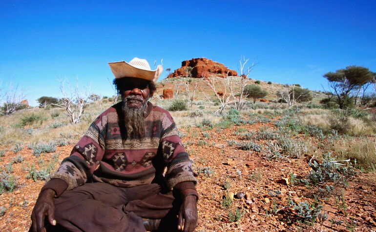 Мужчина из племени Нгааньятджарра сидит, скрестив ноги, в пустыне