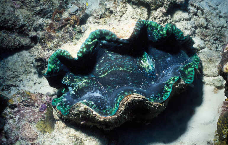 Гигантский двустворчатый моллюск (Tridacna sp.) на Большом Барьерном рифе к северо-востоку от Порт-Дугласа, Квинсленд