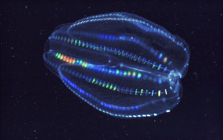 Оранжевопёрая рыба-клоун проплывает сквозь жалящие щупальца морской анемоны на Большом Барьерном рифе