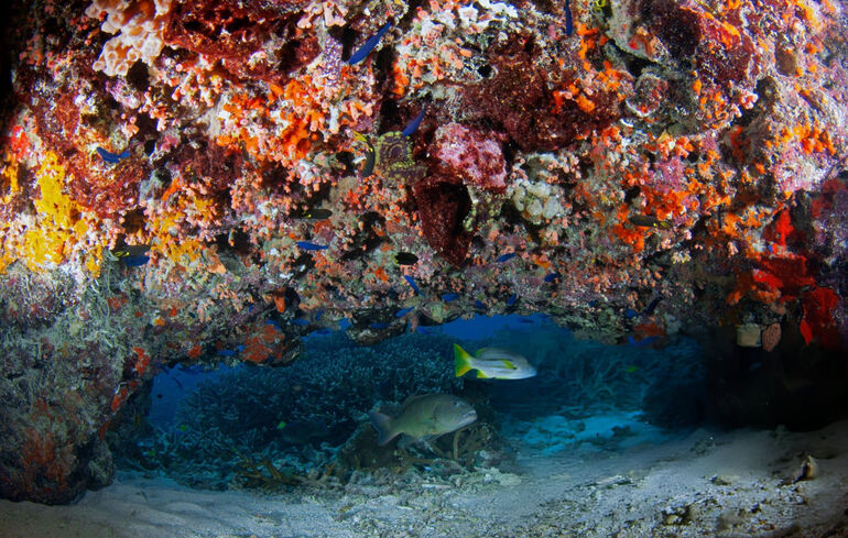 Коралловый групер с коричневыми пятнами (Epinephelus chlorostigma) и луциан с коричневыми полосами (Lutjanus vitta) под красочным навесом из губок, асцидий и кораллов, остров Херон