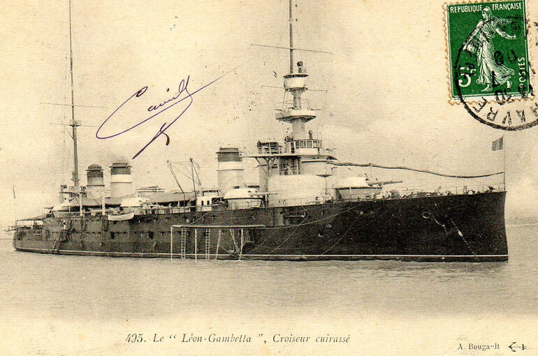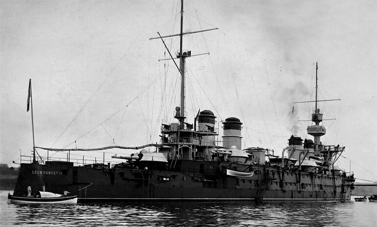 Броненосный крейсер "Леон Гамбетта", вступивший в строй в 1905 году. Водоизмещение — 13 тысяч тонн, длина — 148 метров, вооружение — 4х194-мм и 16х164-мм в башенных спаренных артустановках, 4х164-мм в бортовых казематных установках, а также 22х47-мм скорострельных пушек, Скорость — 22,5 узла, вертикальное бронирование — 150-170 мм, палуба — 60-65 мм.