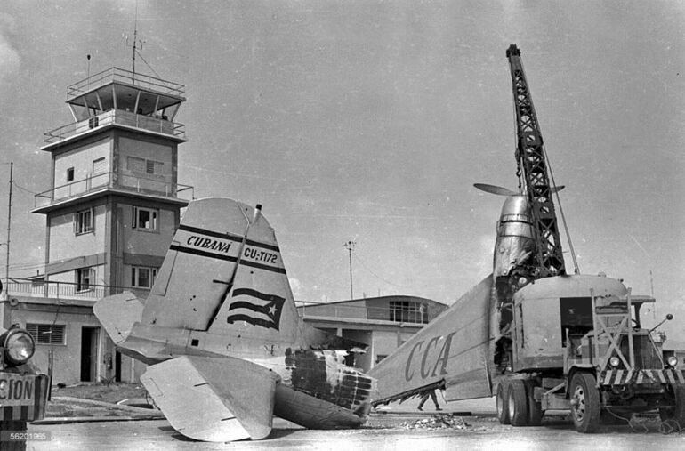 Пассажирский "Дуглас" DC-3 авиакомпании "Кубана", уничтоженный в Гаванском аэропорту при авианалете 15 апреля 1961 года.
