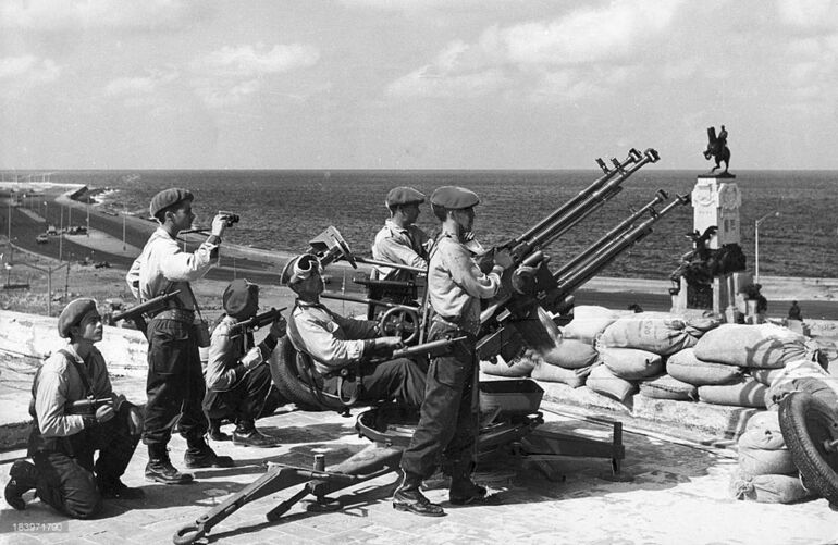 Кубинские зенитчики на гаванской набережной со счетверенной установкой пулеметов ДШК чехословацкого производства.