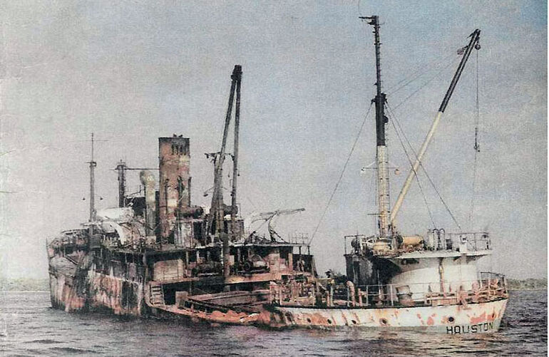 Выбросившийся на отмель и сгоревший транспорт "Хьюстон".