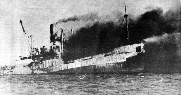 От попаданий корабле возник пожар, а две ракеты взорвались у ватерлинии. Сквозь пробоины в трюм хлынула вода. Заделать бреши не удалось и капитан под угрозой затопления приказал рулевому посадить судно на прибрежную отмель. Бомбардировщик и второй истребитель не добились прямых попаданий. Несмотря на запоздалый огонь зениток, тройка без потерь вернулась на базу.