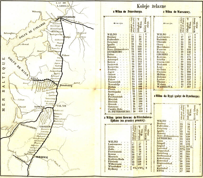 Карта Петербурго-Варшавской железной дороги с указанием рсстояний между станциями.