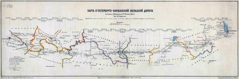 Схематическая карта железной дороги с указанием границ российских губерний, по которым она проходила.
